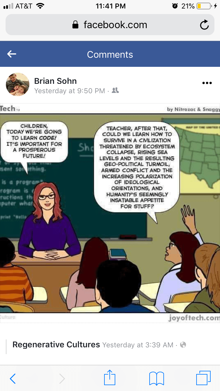 The image at the top of this post presents a dichotomy: schools can blindly teach technology or teach humanity. Kimmerer and those like her present a powerful alternative to combine the teachings of science and post-humanity. Civilization without barbarism. A mutualism that extends beyond a few species. “The democracy of species,” as Kimmerer says. I hope to continue to learn about this potential in science education and become one of its proponents because I know that schools are both places of great indoctrination and places of great resistance. One teacher here and another there make a huge difference.