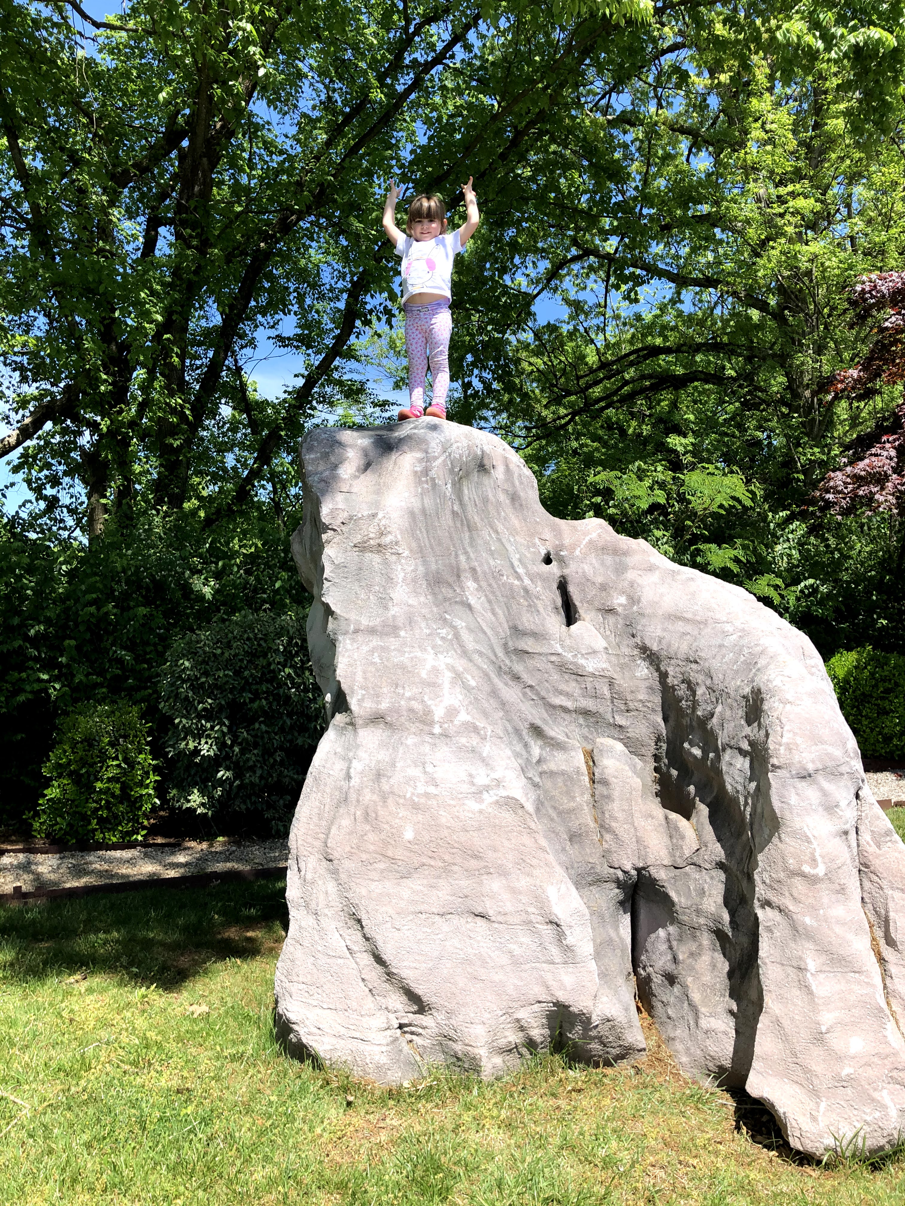 My daughter, 3, climbed all over the little ones, and so did my son, 7. He’s been scared of heights since he climbed too high in the climbing gym when he was 3. But he was feeling successful and ventured to try one of the taller boulders, maybe around 6 feet. It is low angle and easy, but at the top it suddenly drops off because the other side overhangs a bit. As expected , he got scared. I talked him through, encouraging him. He got to the top and sat, nervous. “I know you’re scared, but what are you doing right now?” “Sitting,” he replied. “So you’re…” he cut me off and said, “safe.” I helped him down and asked him how he felt. “My fear of heights is four feet less!” he exclaimed. (My daughter, who is fearless, climbed the same boulder with no issue).