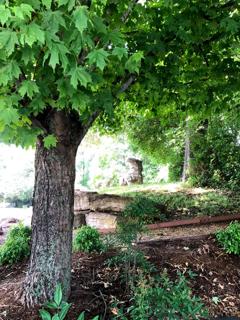 One day this summer I took my kids out climbing. Thanks to some friends with keen (obsessive) eyes for rock, I was alerted to some boulders on a strange little greenway installed next to some office parking lots. The boulders range in size from a foot up to around 10 feet. They are limestone, cut from an old abandoned quarry right over the hill from the greenway. The shapes of the boulders are highly varied, from rounded domes to dinosaur head with teeth. This variety and visual interest make for perfect climbing with young kids.