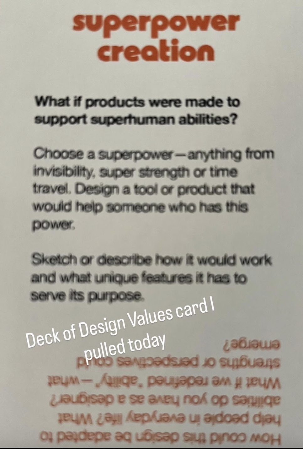 I got a deck of cards from Amplifier Art/Stanford d.school, available here. Every now and then, on a Friday, I’ll pull a card and see where it leads. Today’s card inspired me so much, I had to quit. But here’s what I wrote.