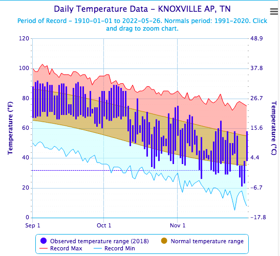 You can see how it just stayed hot, except for October 2nd. Note the brown trend-band. Not until the 12th of October did the high temperature match historical trends. (NOAA)